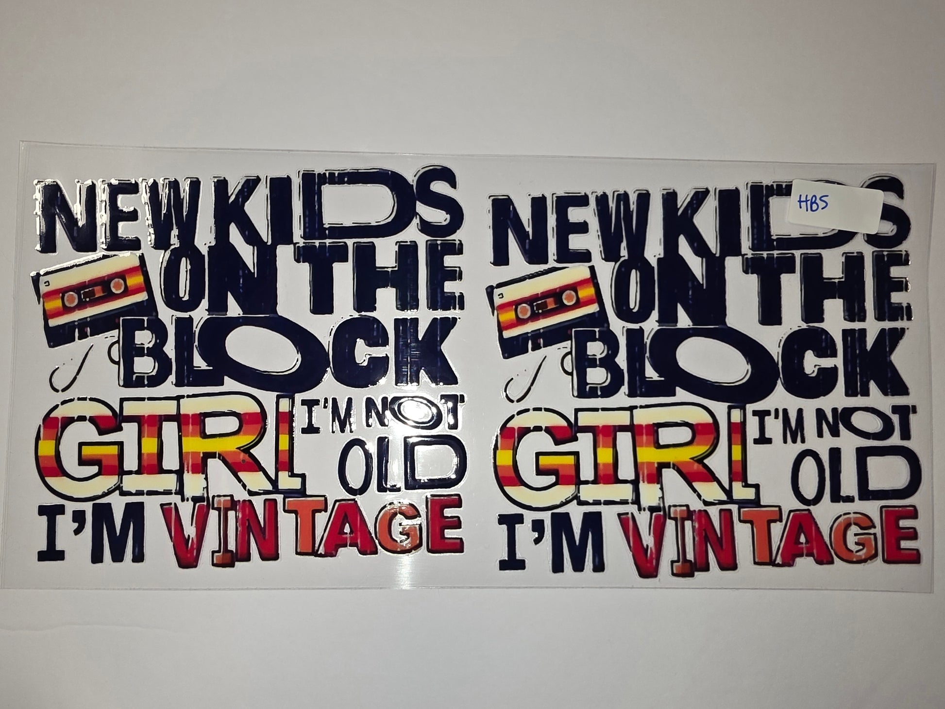 Embrace your inner 80s kid with this fun tumbler wrap featuring "New Kids On The Block" and "Girl I'm Not Old I'm Vintage" text with retro cassette tapes. Perfect for 80s themed parties, music lovers, or anyone who loves a nostalgic vibe on their drinkware.