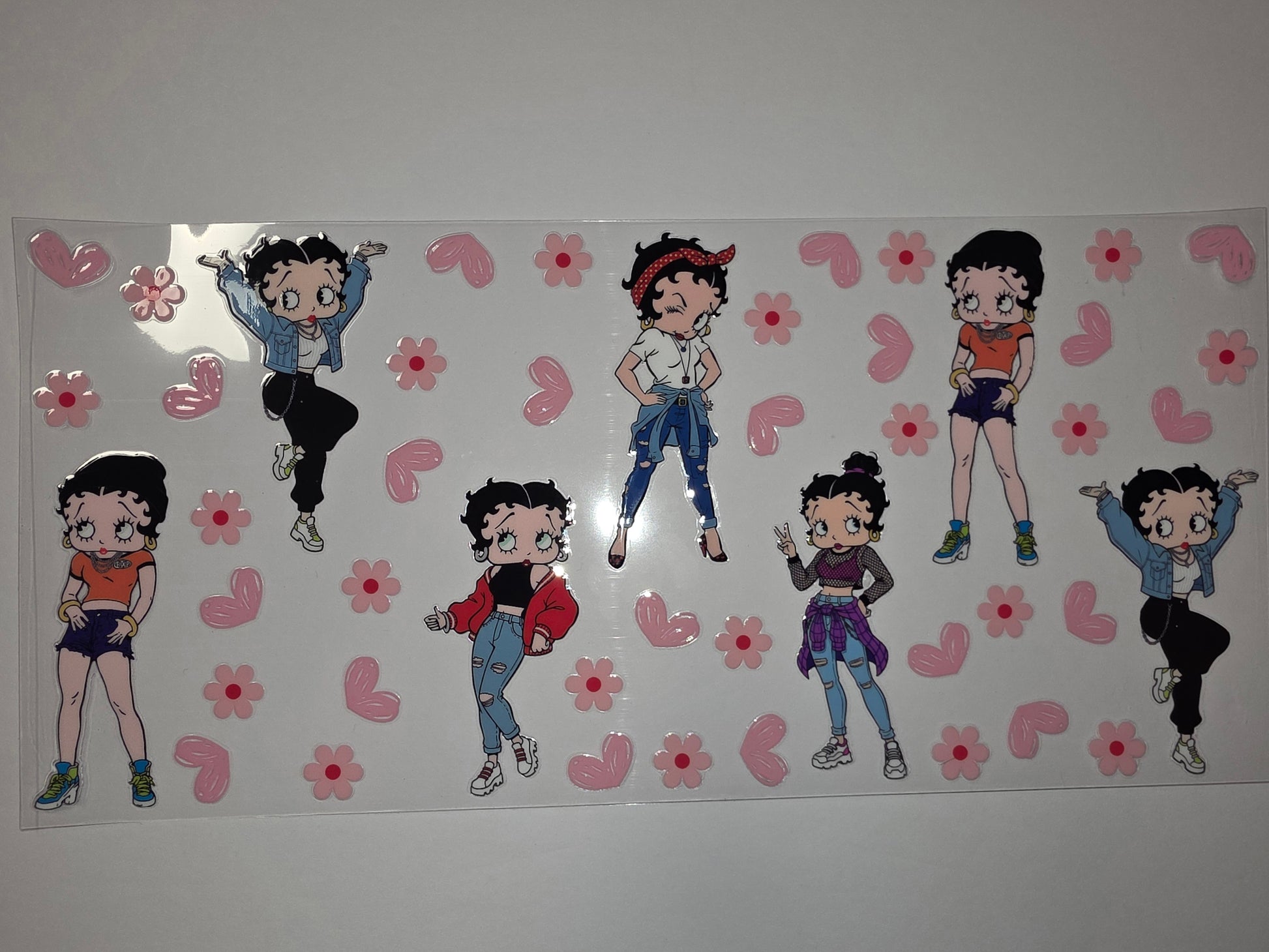 Add a touch of retro charm to your drinkware with this vibrant Betty Boop tumbler wrap. Featuring the iconic cartoon character surrounded by playful pink hearts and flowers, it's perfect for adding personality to your daily coffee or water bottle.