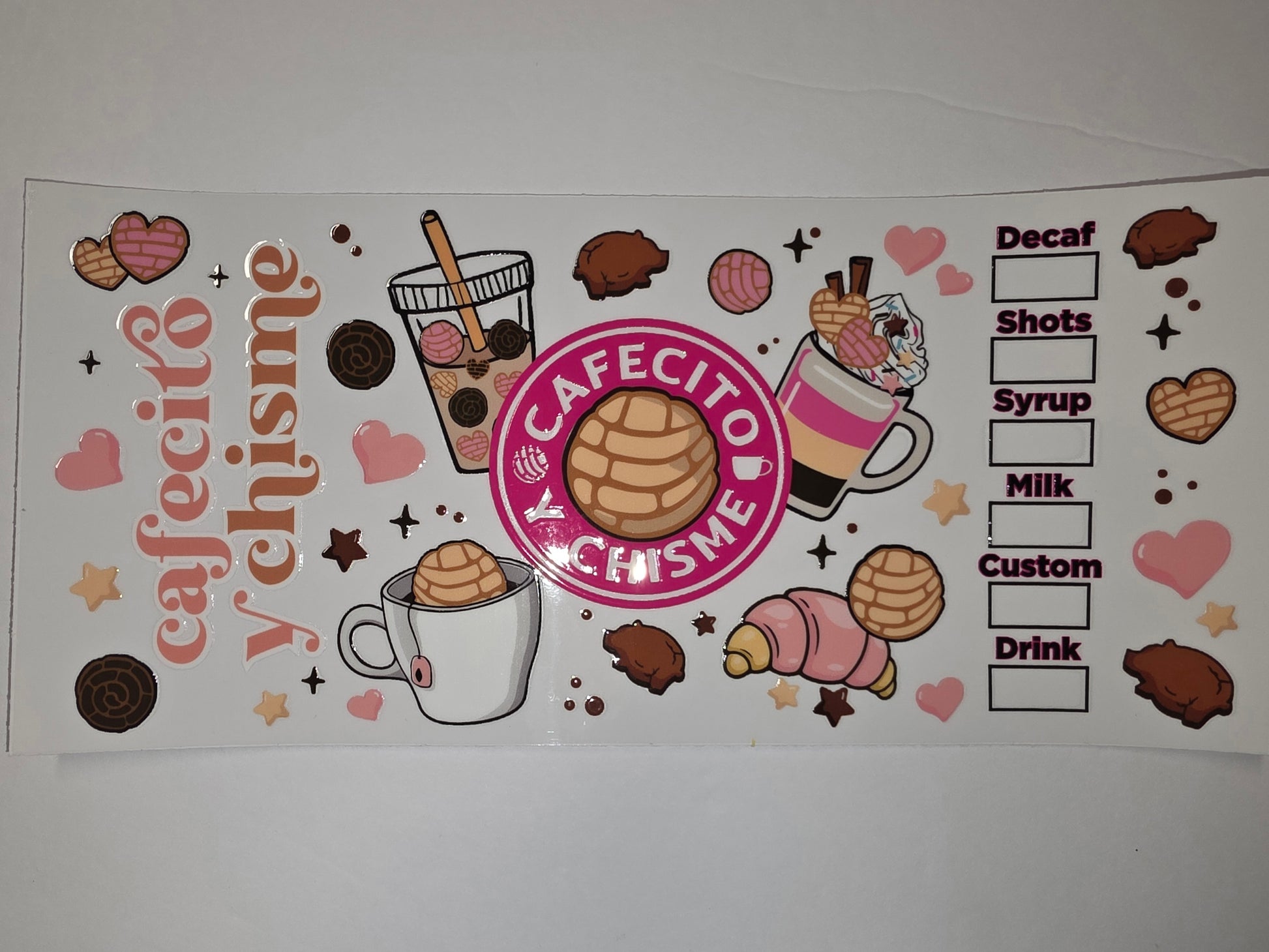 Cafecito y Chisme Tumbler Wrap | Coffee, Conchas, Croissants & Hearts | Pink & Brown