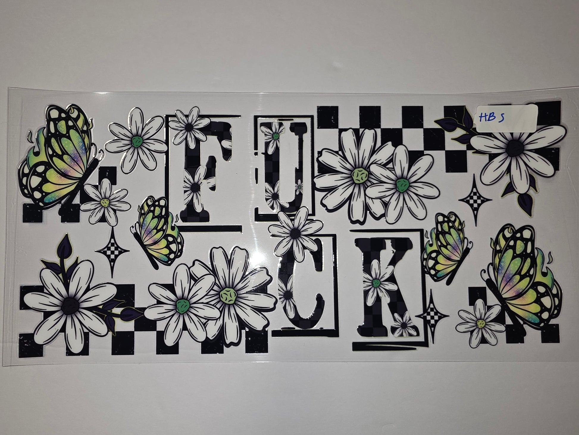 Add a touch of edgy charm to your drinkware with this sublimation wrap featuring vibrant butterflies and classic daisies against a bold checkerboard pattern. Perfect for customizing tumblers, cups, and water bottles with a unique grunge and floral aesthetic.