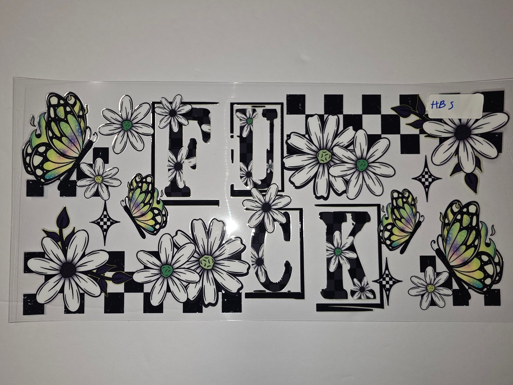 Add a touch of edgy charm to your drinkware with this unique tumbler wrap. Featuring a bold checkerboard pattern, delicate daisies, and vibrant butterflies, it's perfect for adding personality to your everyday cup.