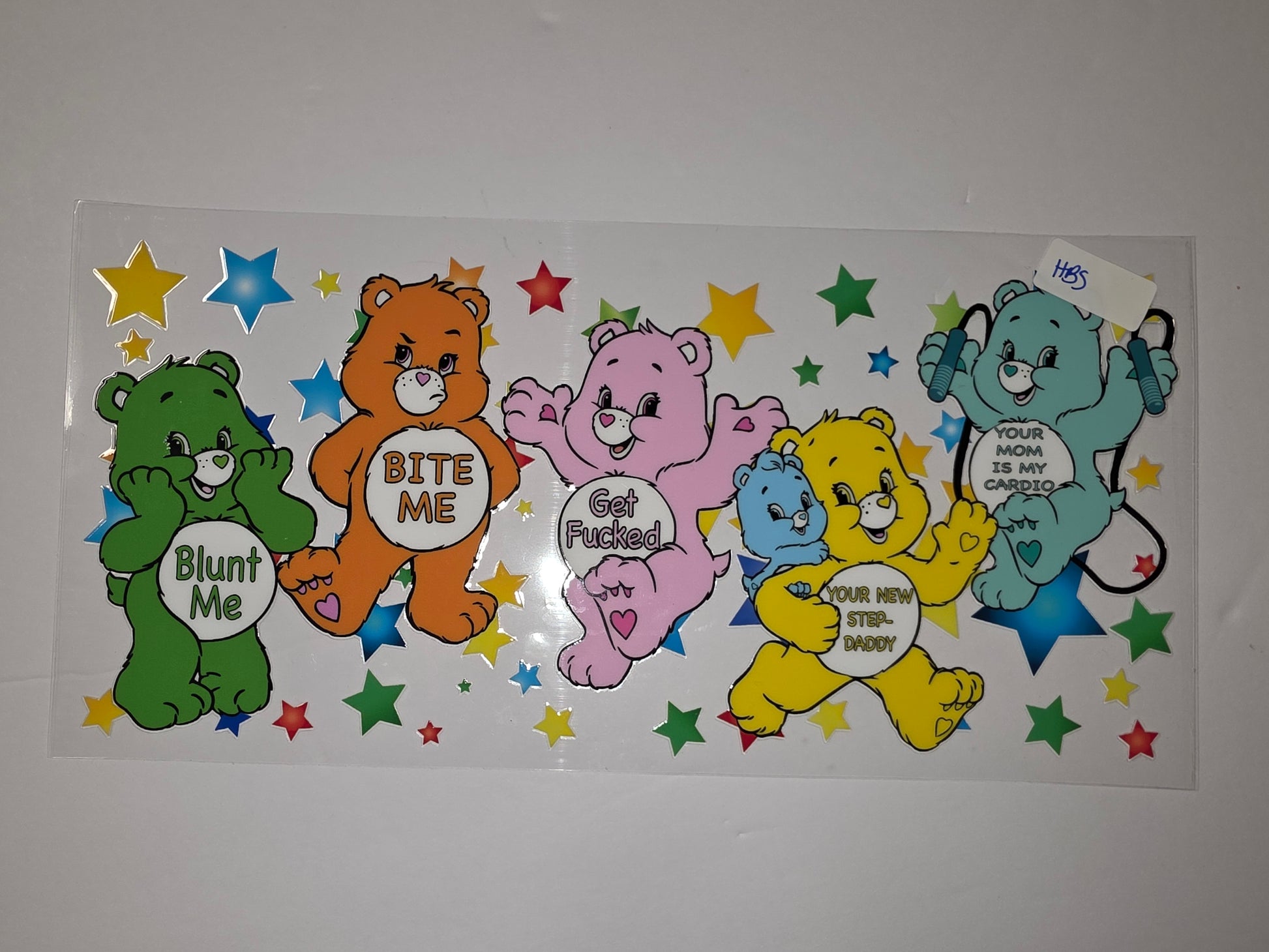 Add a playful and edgy touch to your drinkware with this tumbler wrap featuring a group of colorful bears with humorous sayings. Perfect for personalizing cups, water bottles, or any smooth surface for a unique statement.