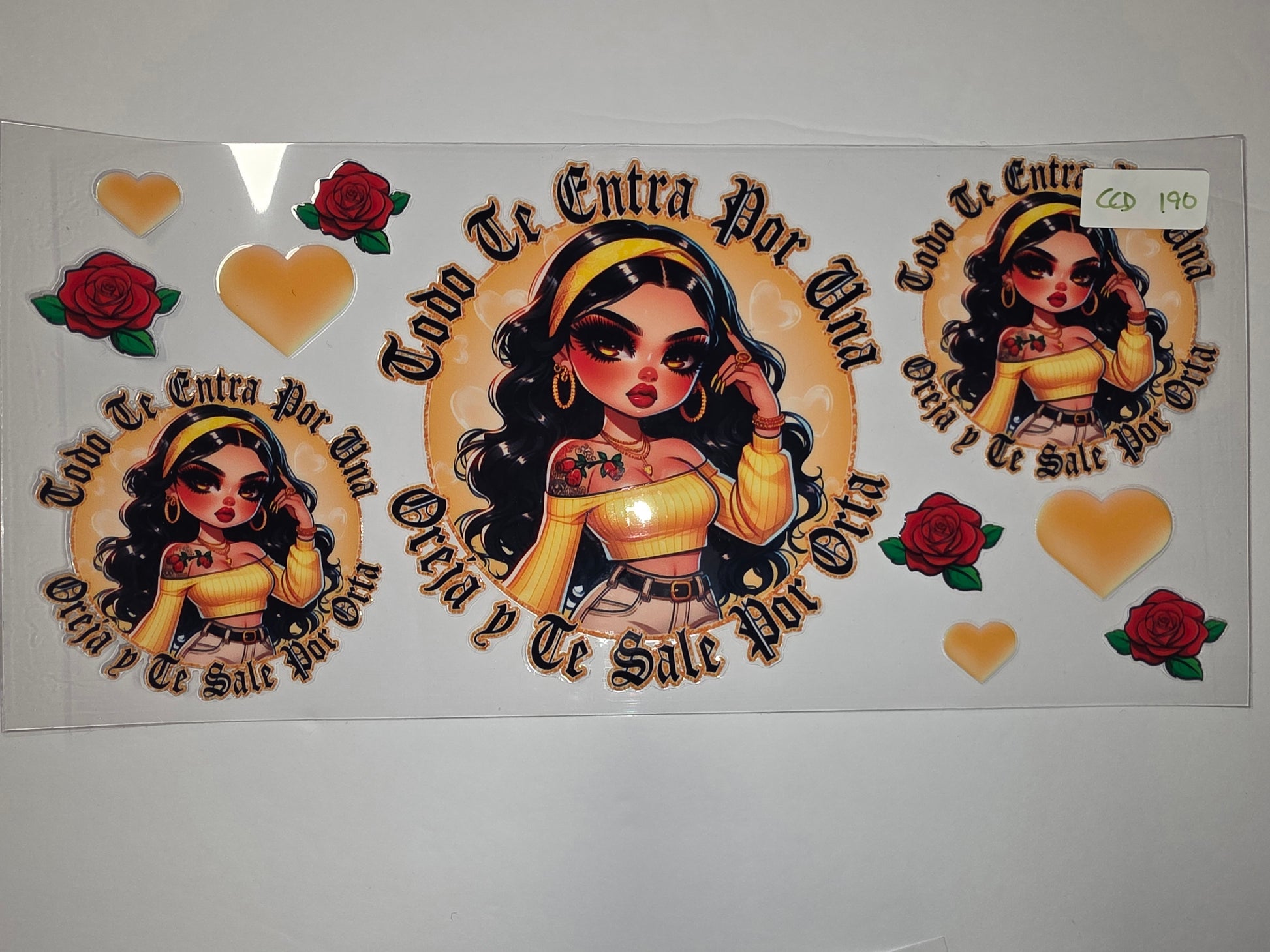 Add a touch of bold style to your drinkware with this vibrant Chicana art tumbler wrap. Featuring a striking illustration of a woman in a yellow top, adorned with roses and hearts, this design is perfect for personalizing cups and tumblers.