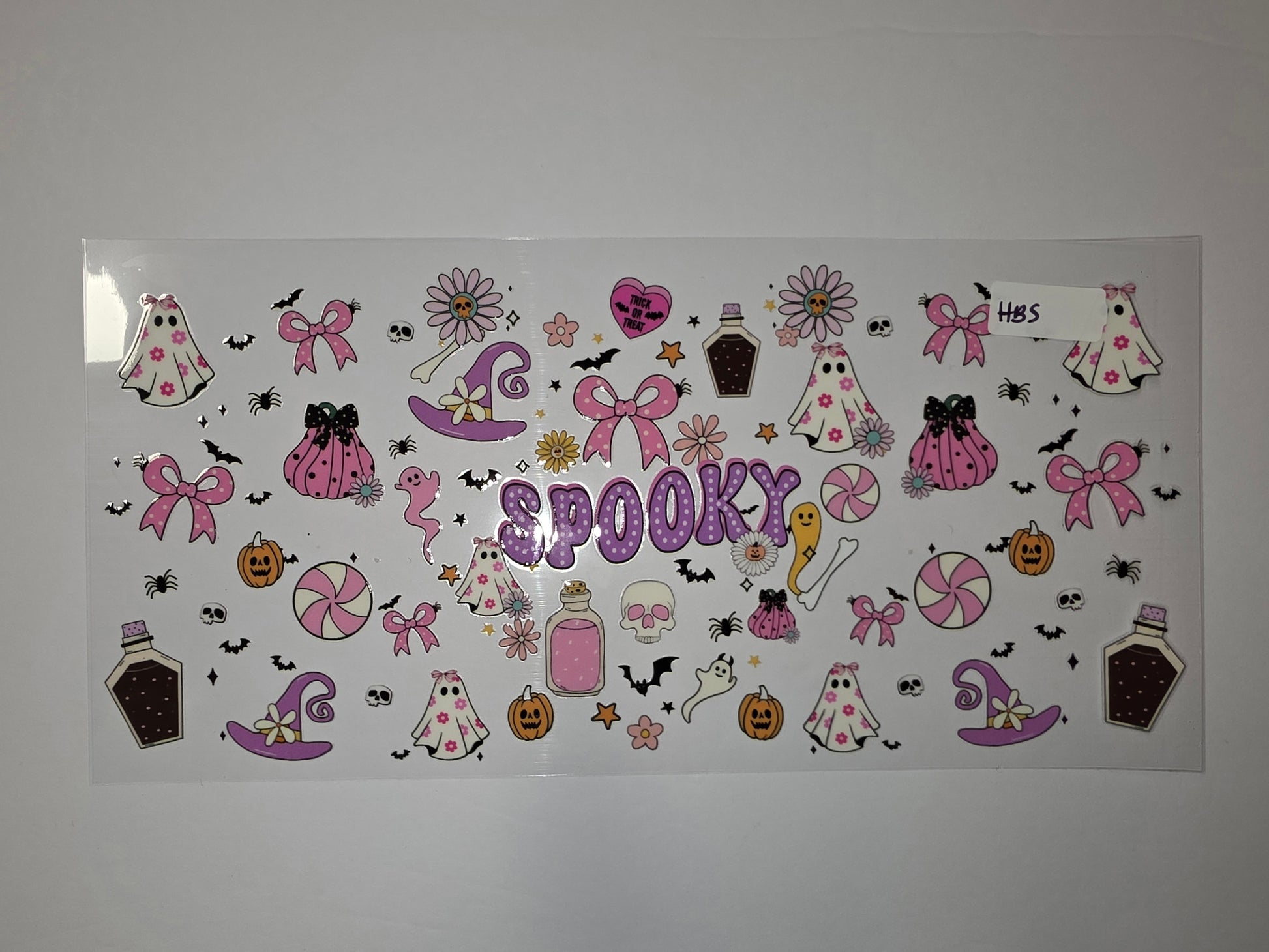 Add a touch of spooky fun to your drinkware with this adorable Halloween tumbler wrap. Featuring playful ghosts, pumpkins, witch hats, and bows in a charming pink and purple palette, it's perfect for seasonal customization.