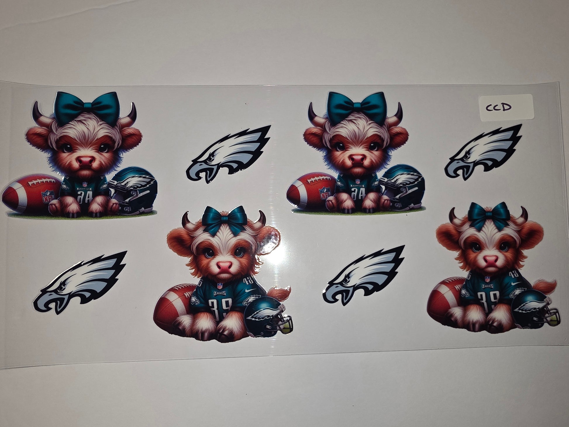 Show your team spirit with this adorable Highland cow tumbler wrap featuring the Eagles football theme. Perfect for Eagles fans, this design includes a cute cow character in team colors, a football, and a helmet, complete with a stylish teal bow.