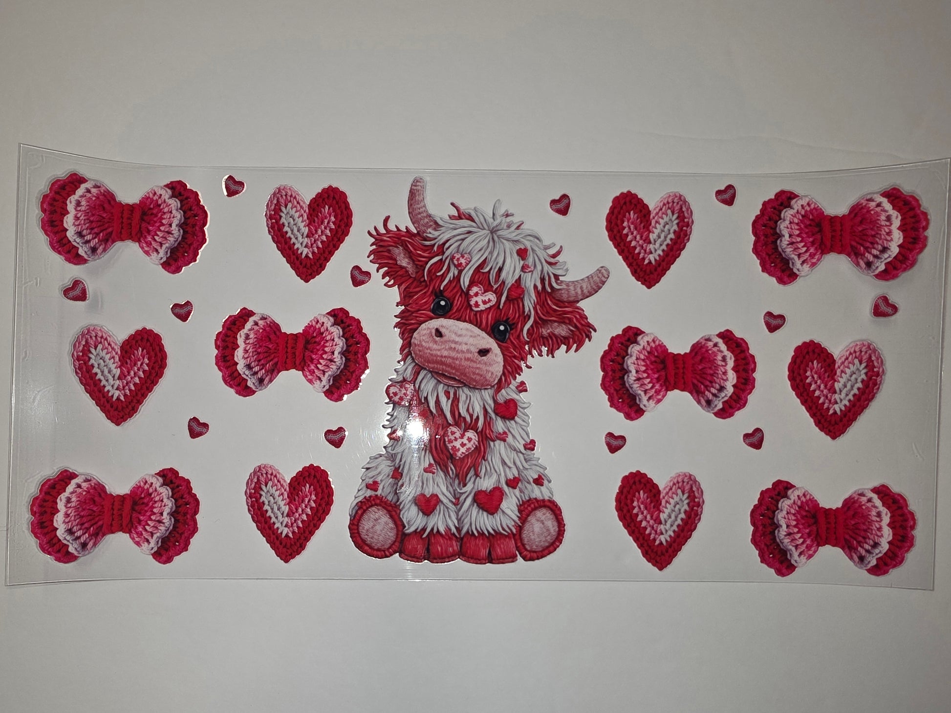 Add a touch of adorable charm to your drinkware with this Valentine's Day tumbler wrap featuring a sweet Highland cow surrounded by crocheted-style hearts and bows. Perfect for personalizing cups, water bottles, or gifts for loved ones.