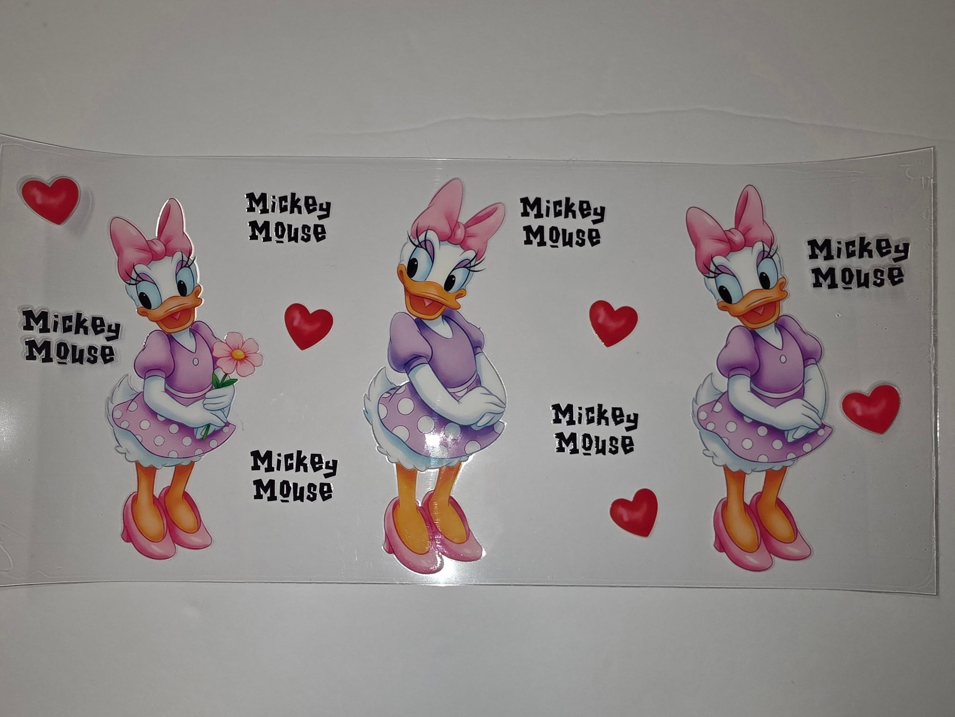 Add a touch of Disney magic to your drinkware with this adorable Daisy Duck tumbler wrap. Featuring Daisy in her signature pink polka dot dress and surrounded by sweet red hearts, this design is perfect for fans of all ages. Ideal for personalizing tumblers, cups, and water bottles for a fun and charming look.