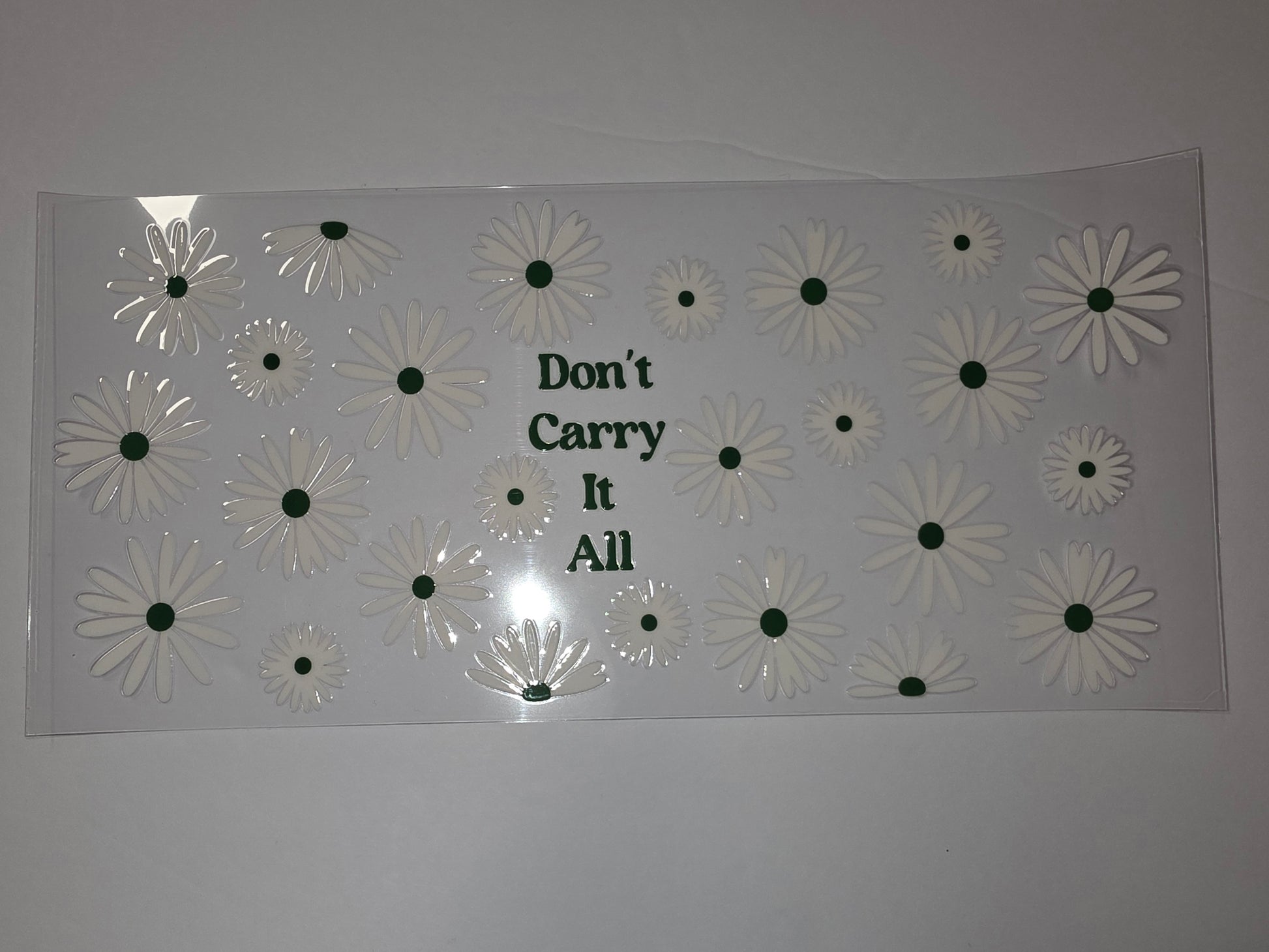 Add a touch of floral charm to your drinkware with this beautiful daisy tumbler wrap. Featuring a repeating pattern of white daisies with green centers and an inspiring "Don't Carry It All" quote, it's perfect for adding a cheerful and motivational vibe to your daily hydration.