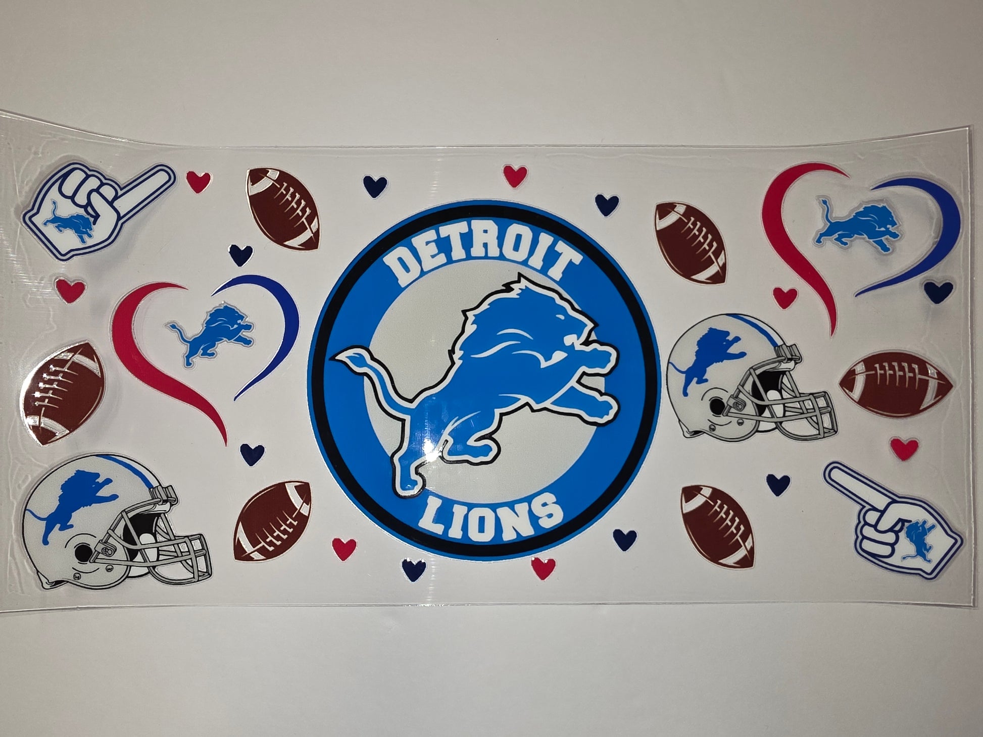 Show your team spirit with this vibrant Detroit Lions tumbler wrap. Featuring the iconic lion logo, footballs, helmets, and hearts in blue, red, and white, it's perfect for any fan's drinkware. Ideal for game days or everyday use to showcase your Lions pride.