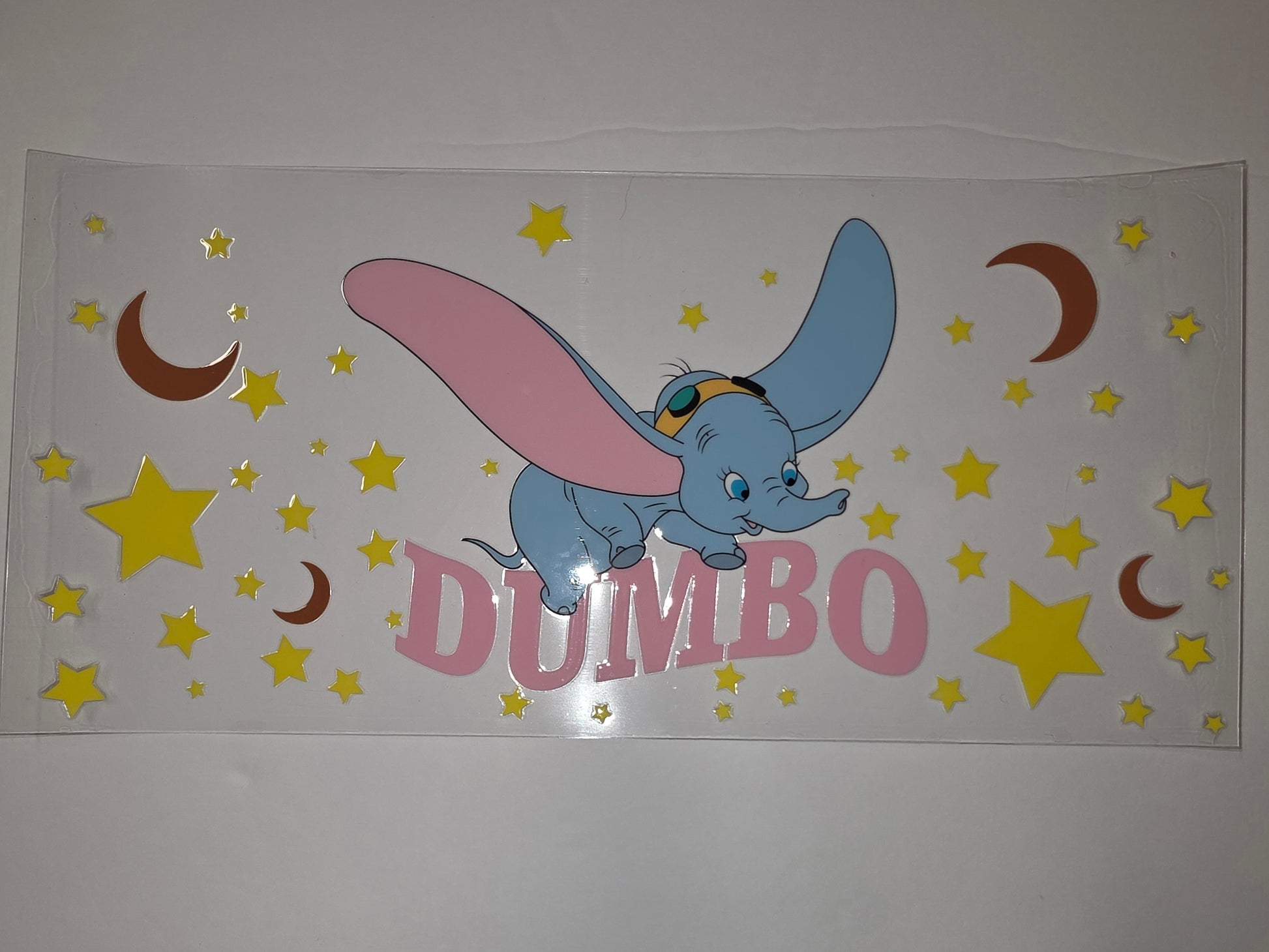 Add a touch of magic to your drinkware with this adorable Dumbo tumbler wrap. Featuring the beloved flying elephant surrounded by whimsical pink and yellow stars and moons, it's perfect for Disney fans of all ages. Ideal for customizing tumblers, cups, and water bottles for a touch of enchantment.