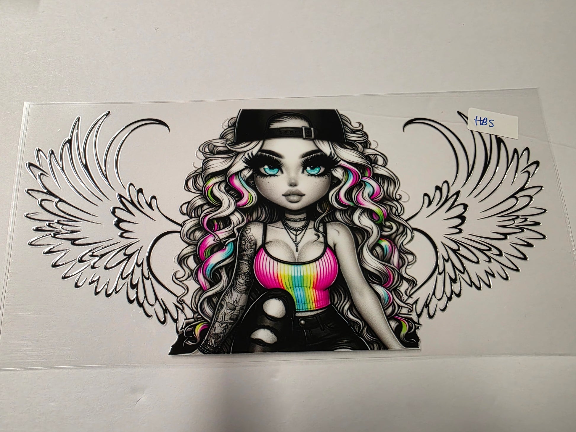 Edgy Angel Girl Tumbler Wrap - Rainbow Hair, Black & White Design