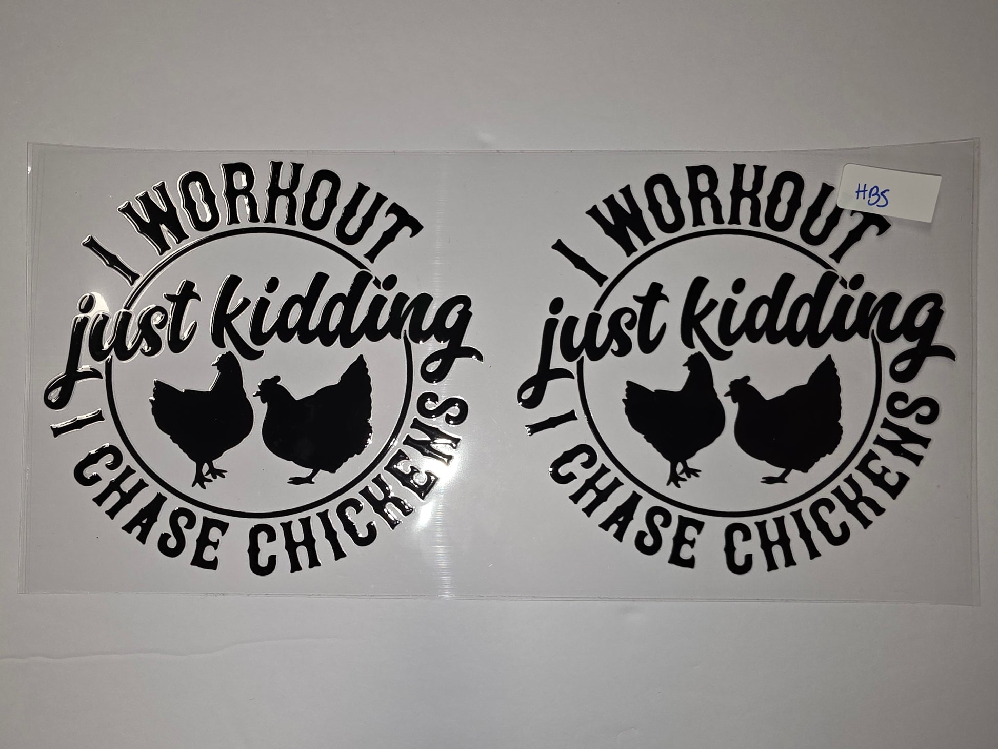 Add a touch of humor to your drinkware with this "I Workout Just Kidding I Chase Chickens" tumbler wrap. Featuring a playful design with chickens and bold lettering, it's perfect for chicken lovers and anyone who enjoys a good laugh.