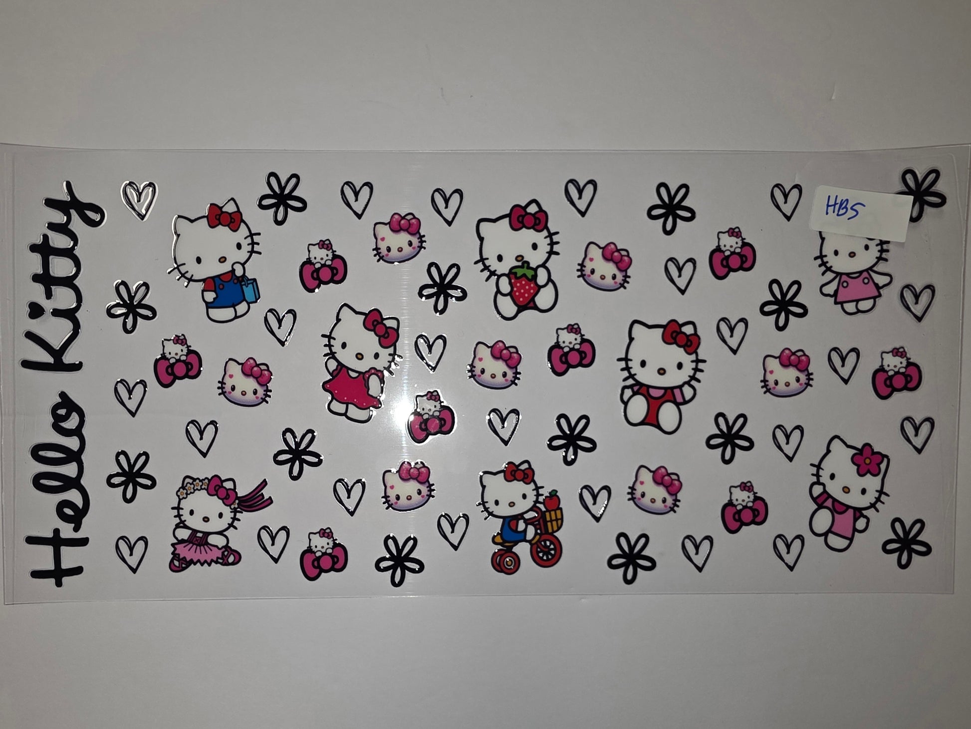 Add a touch of adorable charm to your drinkware with this vibrant Hello Kitty tumbler wrap. Featuring the iconic character in various cute poses with pink and red bows, hearts, and flowers, it's perfect for personalizing cups, water bottles, and more.