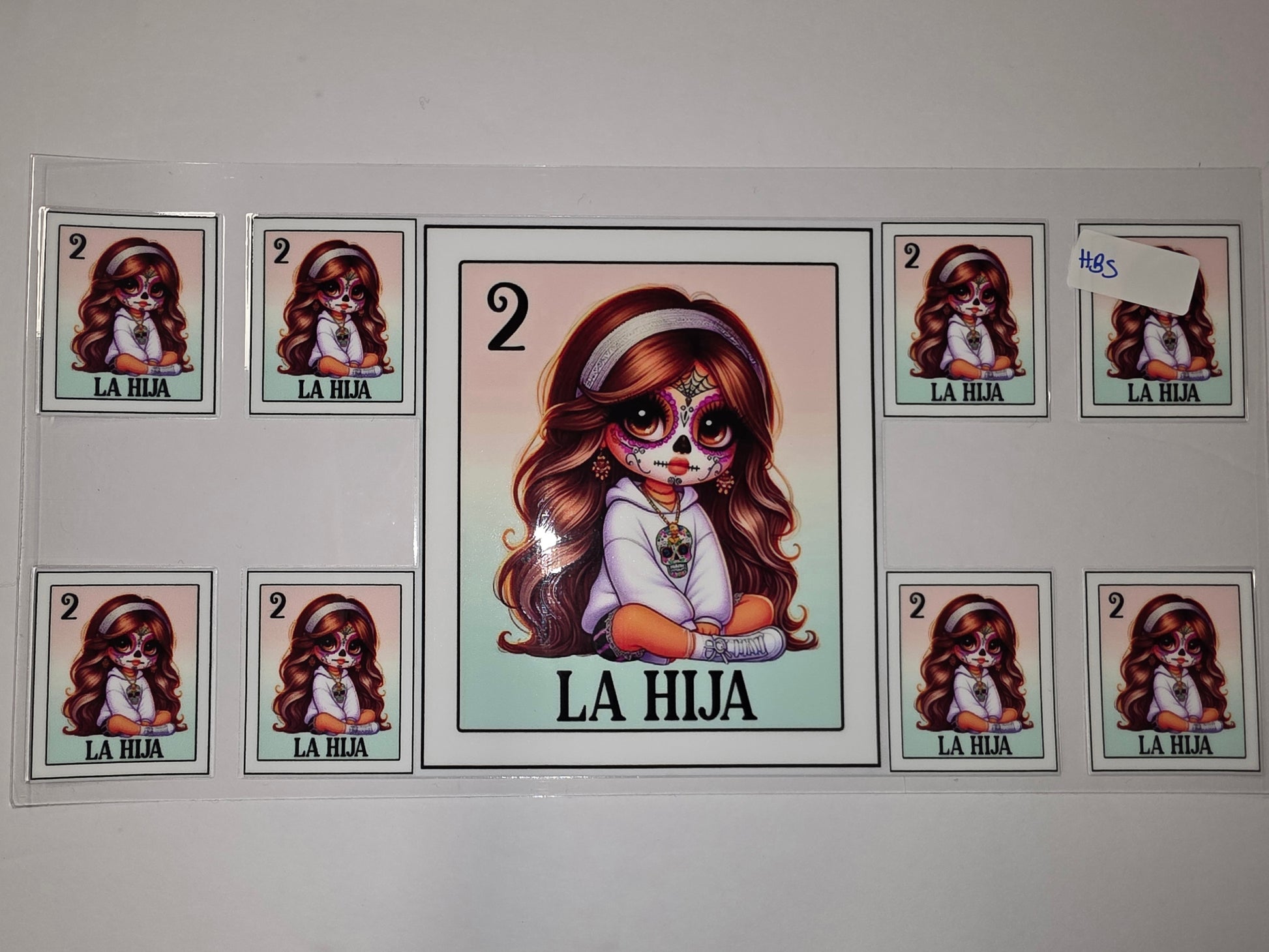 Add a touch of Dia de los Muertos flair to your drinkware with this "La Hija" sugar skull girl tumbler wrap. Featuring a cute, stylized character with intricate face paint and flowing hair, this design is perfect for adding personality to your daily coffee or water cup.