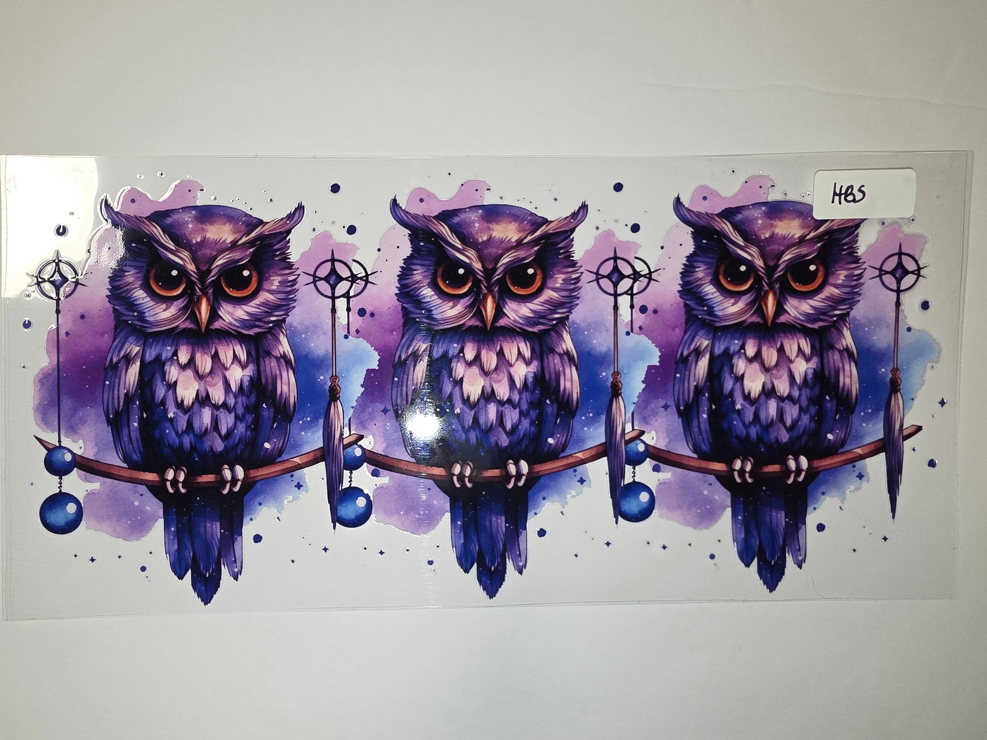 Add a touch of magic to your drinkware with this stunning tumbler wrap featuring three mystical owls perched on a branch. The cosmic watercolor background in shades of purple and blue creates an enchanting, celestial vibe perfect for any owl lover.