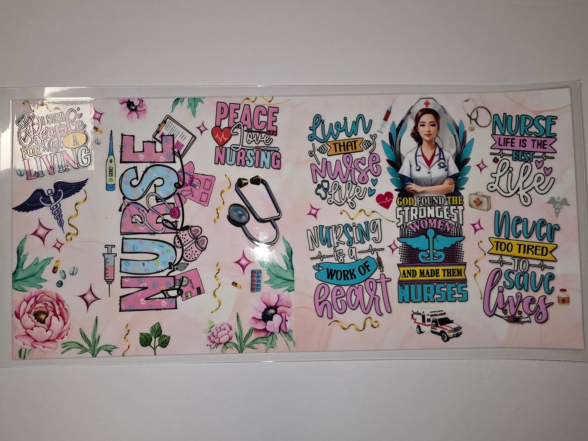 Show your nursing pride with this vibrant tumbler wrap featuring "Nurse Life" text, medical icons like stethoscopes and syringes, and beautiful floral accents. Perfect for nurses, nursing students, or anyone in the healthcare field who loves a touch of pink and teal.