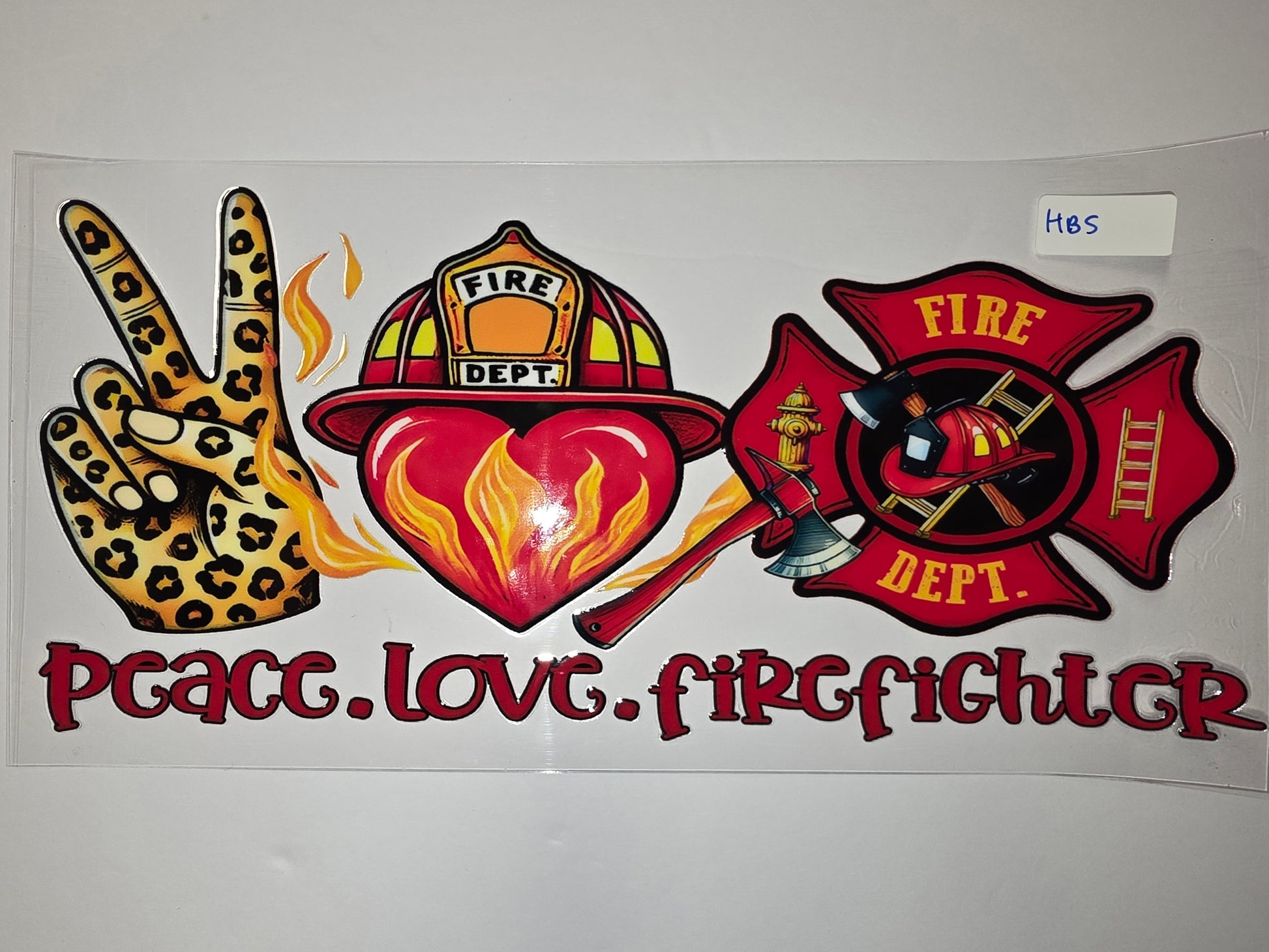 Peace Love Firefighter Tumbler Wrap - Leopard Print, Fire Heart, Maltese Cross
