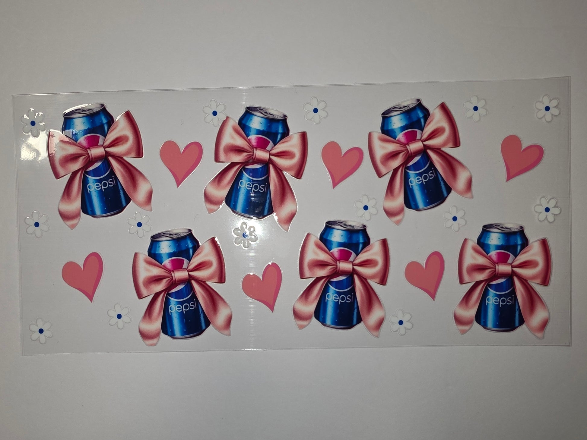 Add a touch of retro charm to your favorite tumbler with this adorable Pepsi can wrap. Featuring a classic blue Pepsi can adorned with a delicate pink bow, this design is perfect for soda lovers and adds a playful pop to your drinkware.