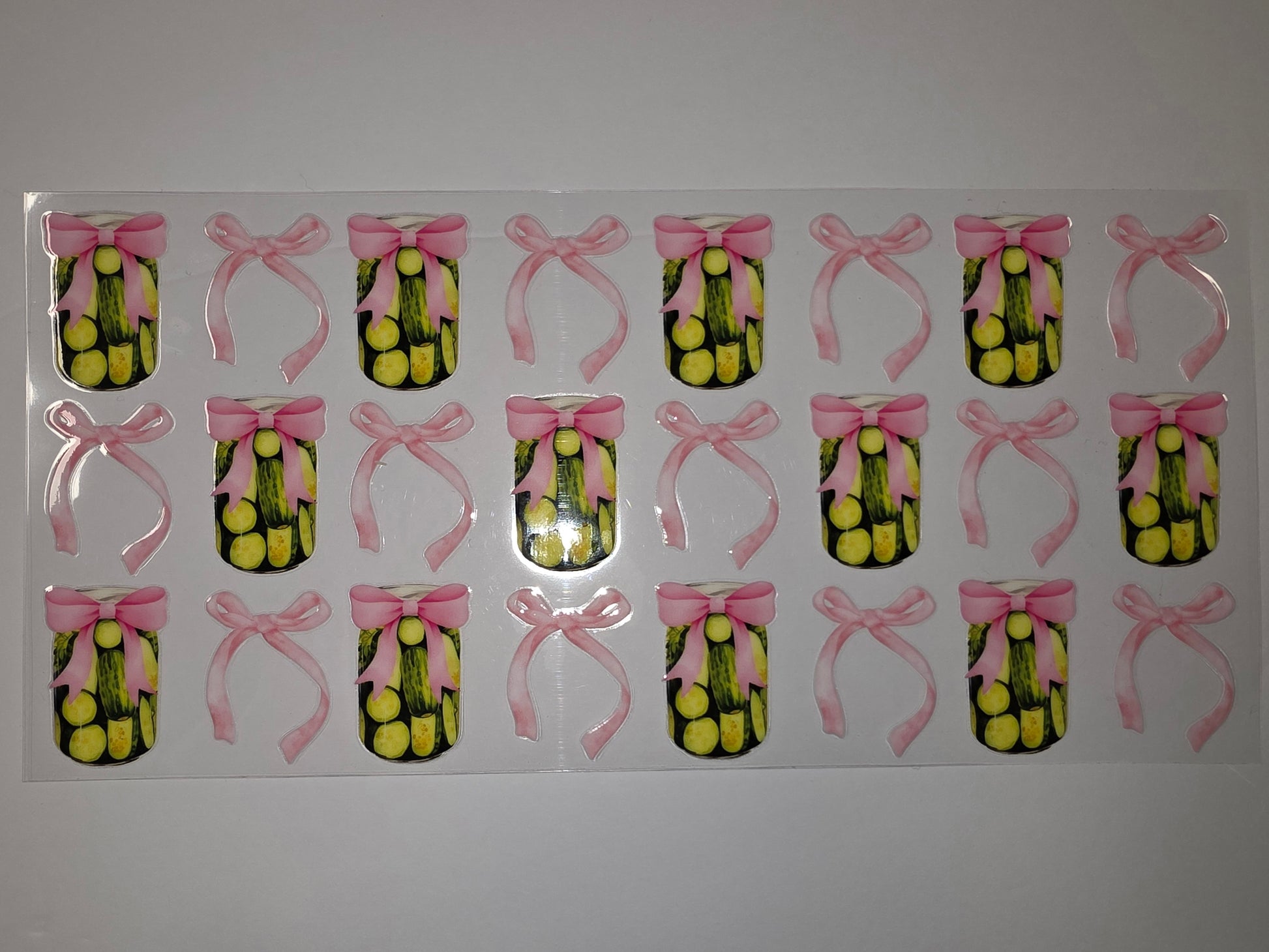 Add a touch of quirky charm to your drinkware with this adorable pickle jar tumbler wrap. Featuring a vibrant design of pickles in a jar adorned with a sweet pink bow, it's perfect for pickle lovers and anyone who enjoys unique, fun aesthetics.