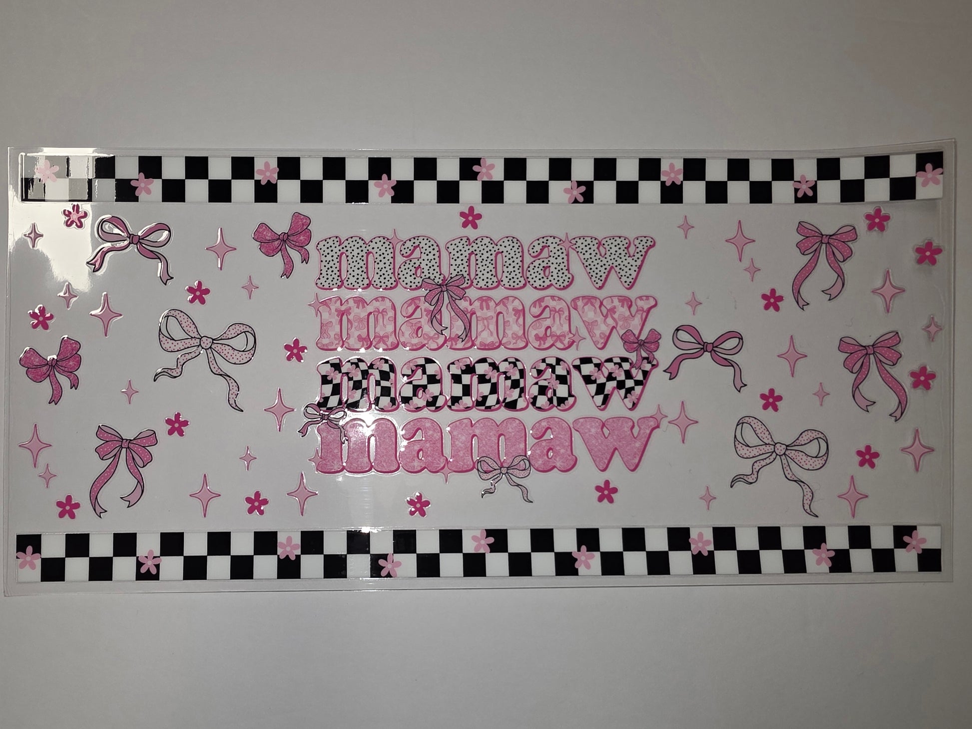 Add a touch of playful charm to your drinkware with this "Mamaw" tumbler wrap. Featuring a delightful mix of pink bows, flowers, stars, and a trendy checkered pattern, it's perfect for personalizing cups and gifts for any occasion.