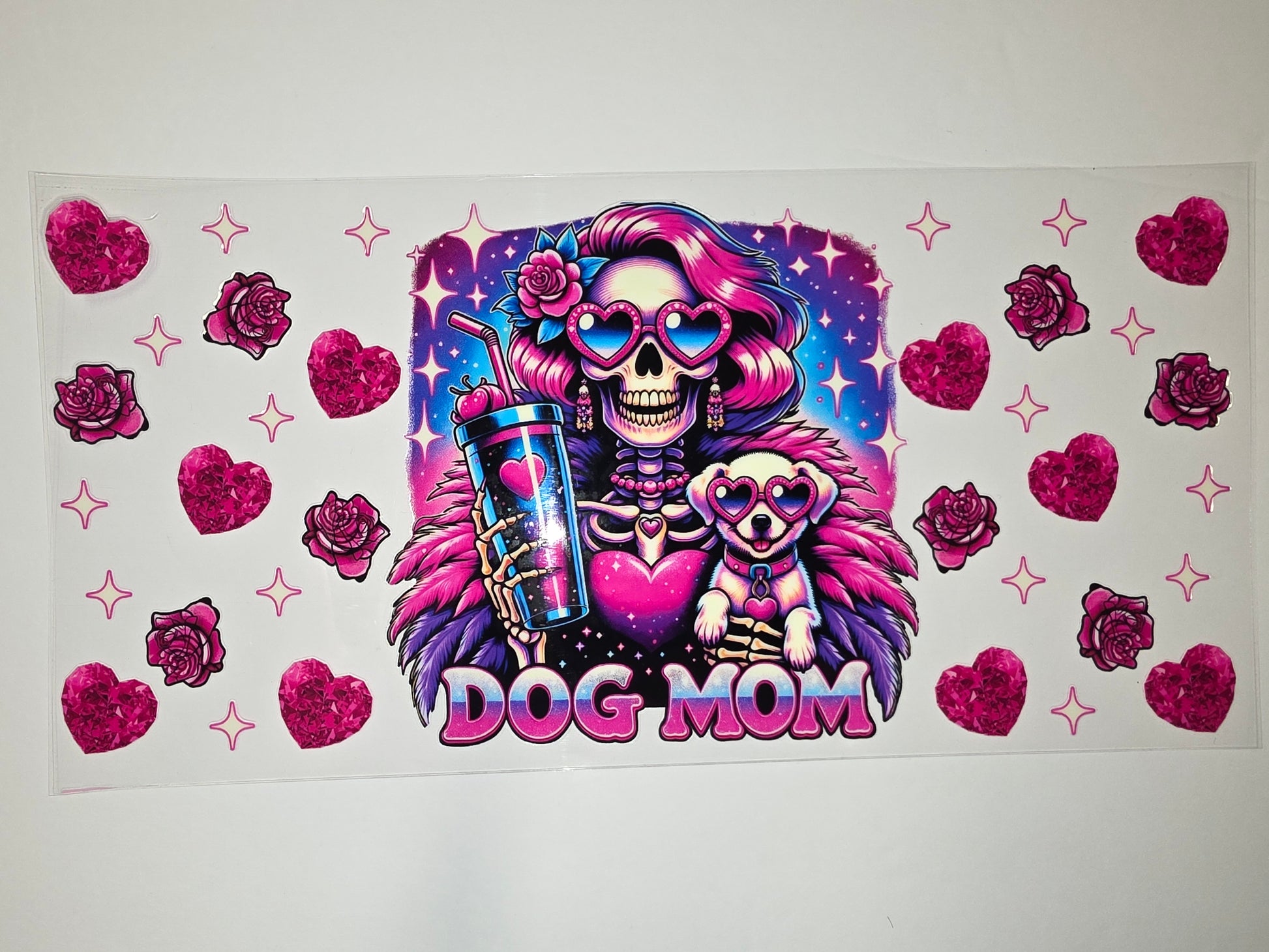 Show off your love for your furry friend with this vibrant "Dog Mom" tumbler wrap. Featuring a stylish skeleton with heart sunglasses, a cute puppy, and a backdrop of pink roses and sparkling stars, it's perfect for any dog-loving mom.