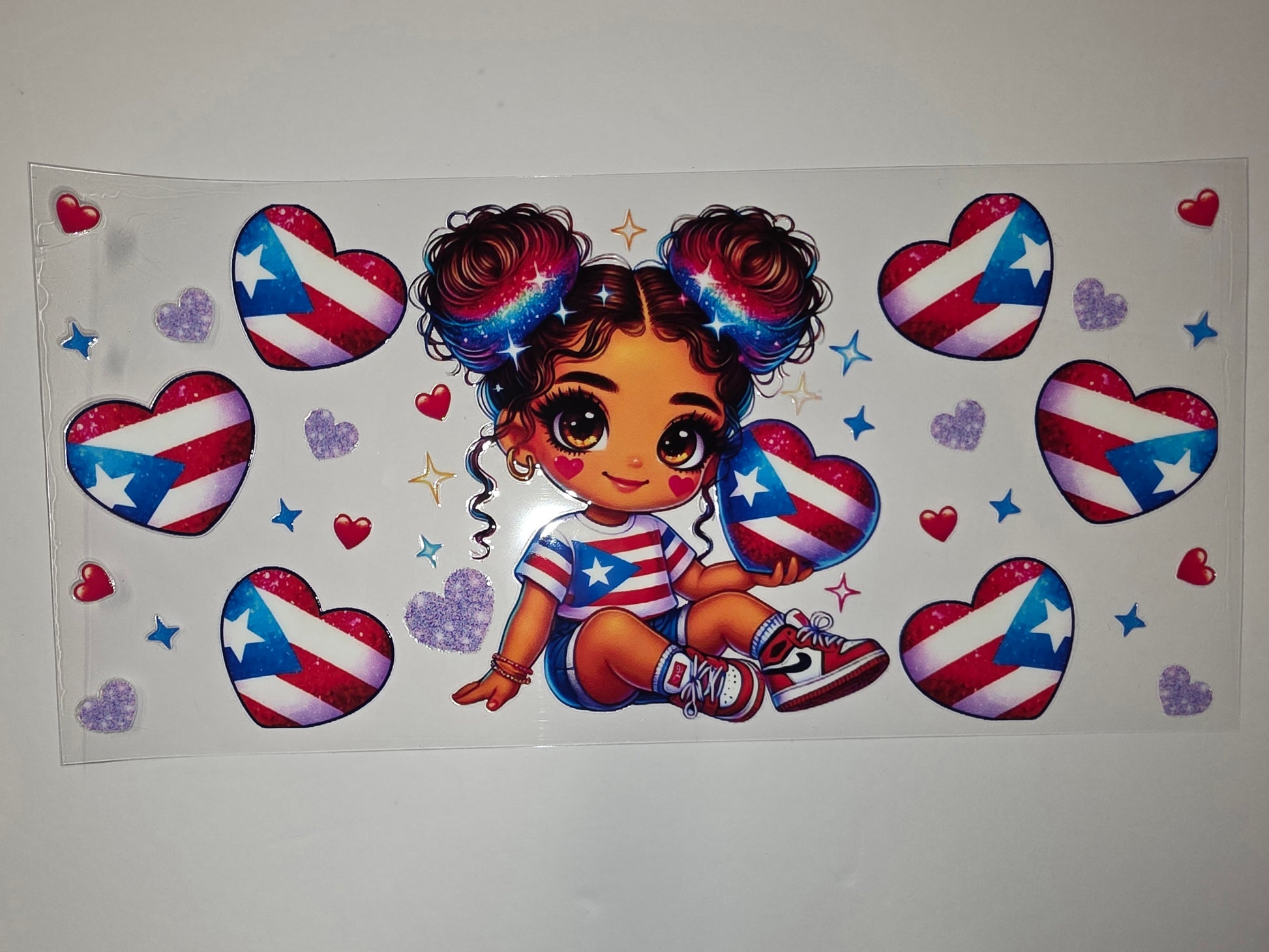 Show your pride with this vibrant tumbler wrap featuring a cute girl with Puerto Rican flag hearts and sparkling accents. Perfect for customizing cups, water bottles, and gifts for anyone who loves Puerto Rico.