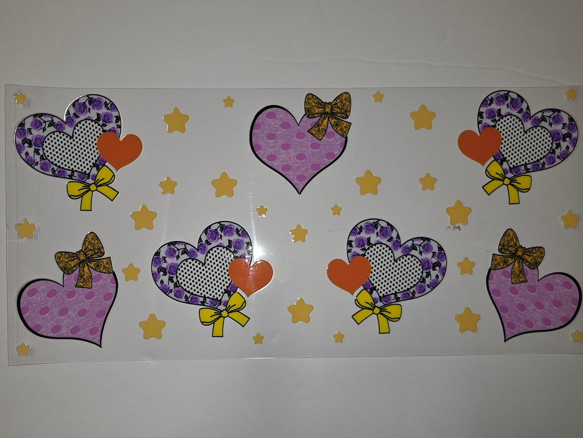 Add a touch of whimsical charm to your drinkware with this vibrant tumbler wrap. Featuring a delightful mix of purple floral hearts, playful polka dots, and cheerful yellow stars, it's perfect for adding personality to your daily hydration.