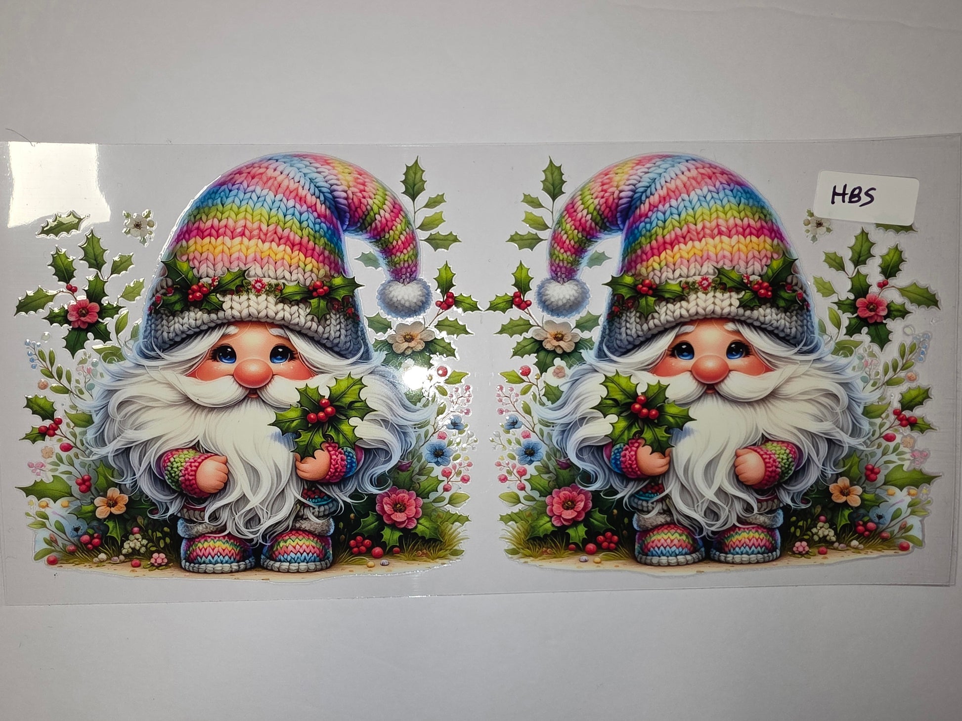 Add a touch of whimsical charm to your drinkware with this delightful gnome tumbler wrap. Featuring a vibrant rainbow-striped hat and festive holly accents, it's perfect for adding holiday cheer to your coffee mug or water bottle.