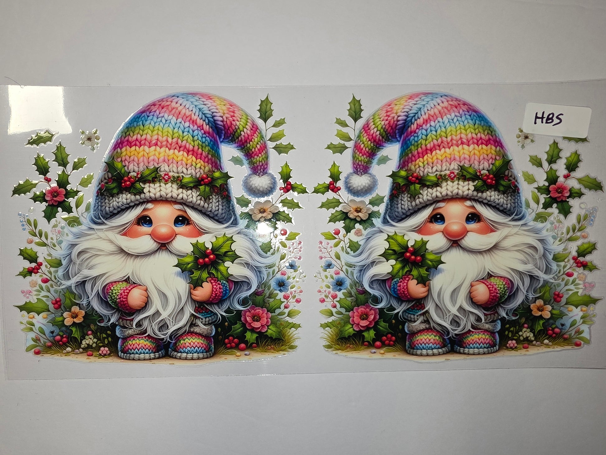 Add a touch of whimsical charm to your drinkware with this delightful tumbler wrap featuring a gnome with a vibrant rainbow knit hat. Surrounded by festive holly and delicate flowers, this design is perfect for adding a cheerful, cozy vibe to your cups.
