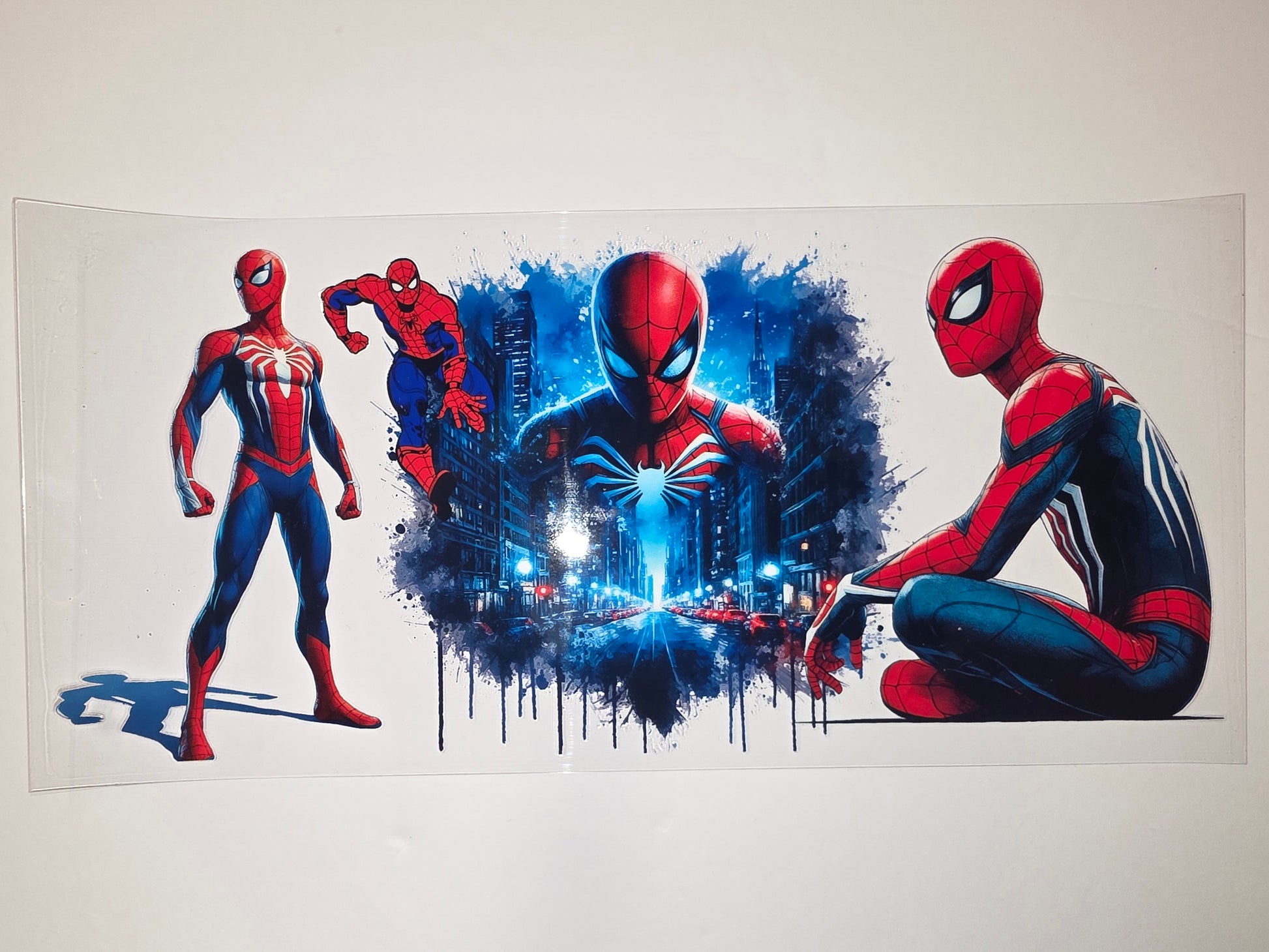 Showcase your love for the web-slinger with this dynamic Spiderman tumbler wrap. Featuring iconic poses and a vibrant cityscape, it's perfect for any fan's daily hydration. Add a heroic touch to your coffee mug, water bottle, or travel cup.