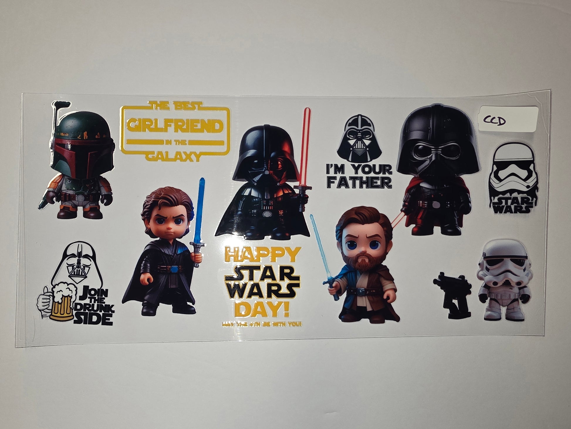 Bring the Force to your drinkware with this fun Star Wars chibi tumbler wrap. Featuring iconic characters like Darth Vader, Stormtrooper, Boba Fett, Obi-Wan, and Anakin, it's perfect for any fan. Add a touch of galactic charm to your daily coffee or iced beverage.