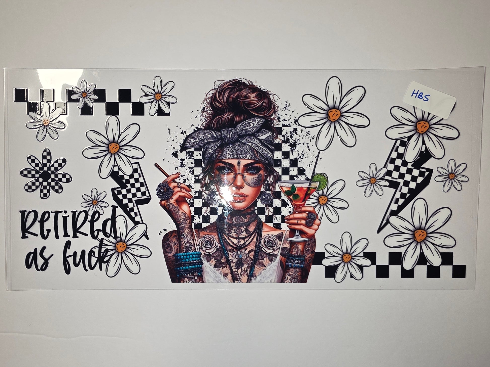 Embrace your inner rebel with this edgy tumbler wrap featuring a tattooed woman, daisies, and a classic checkerboard pattern. Perfect for adding a touch of retro boho flair to your favorite cup, this design is ideal for anyone who loves bold, unique style.