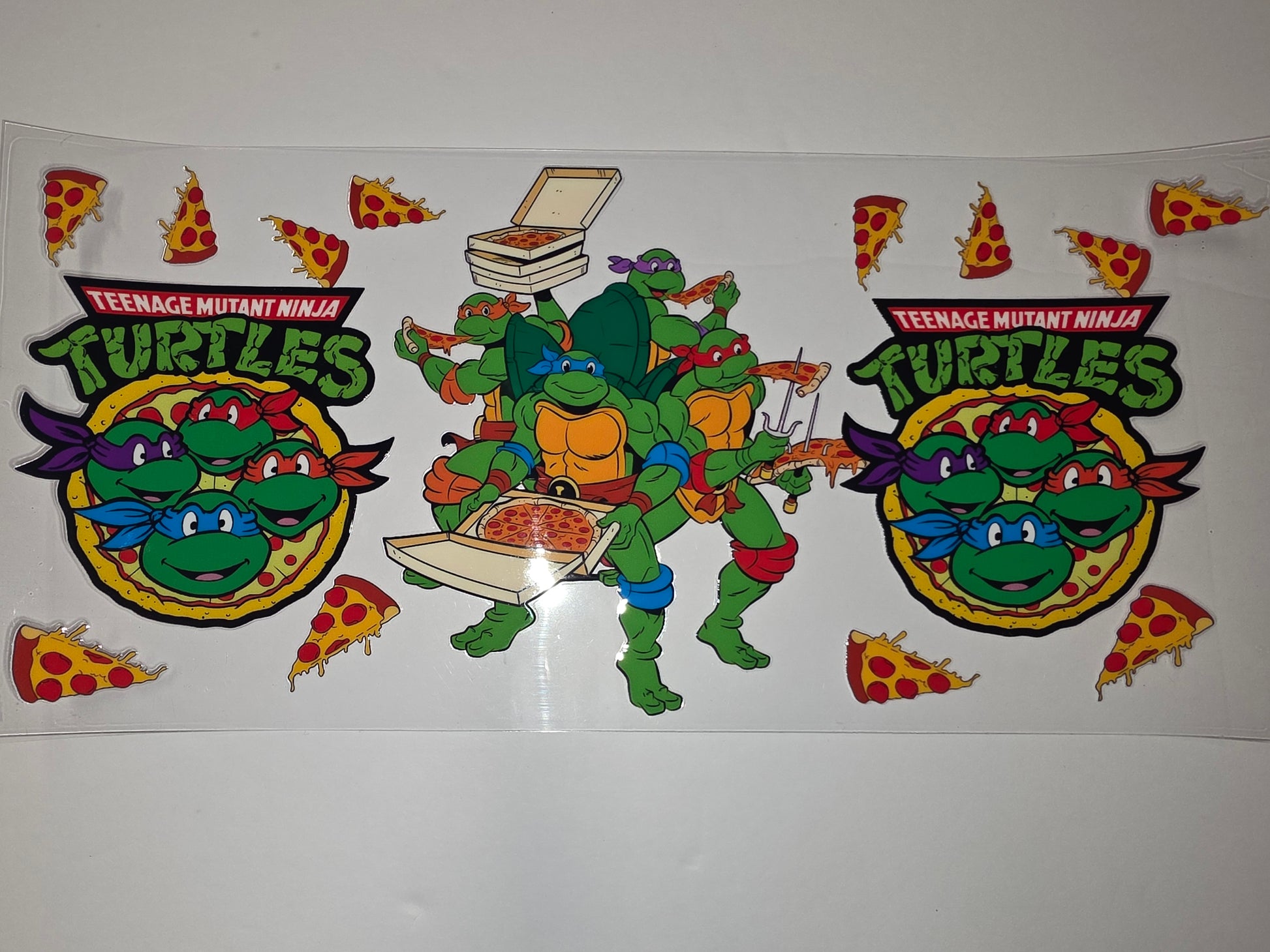 Cowabunga! This vibrant tumbler wrap features the iconic Teenage Mutant Ninja Turtles enjoying their favorite food - pizza! Perfect for fans of the classic cartoon, this design adds a fun and nostalgic touch to any cup or drinkware.