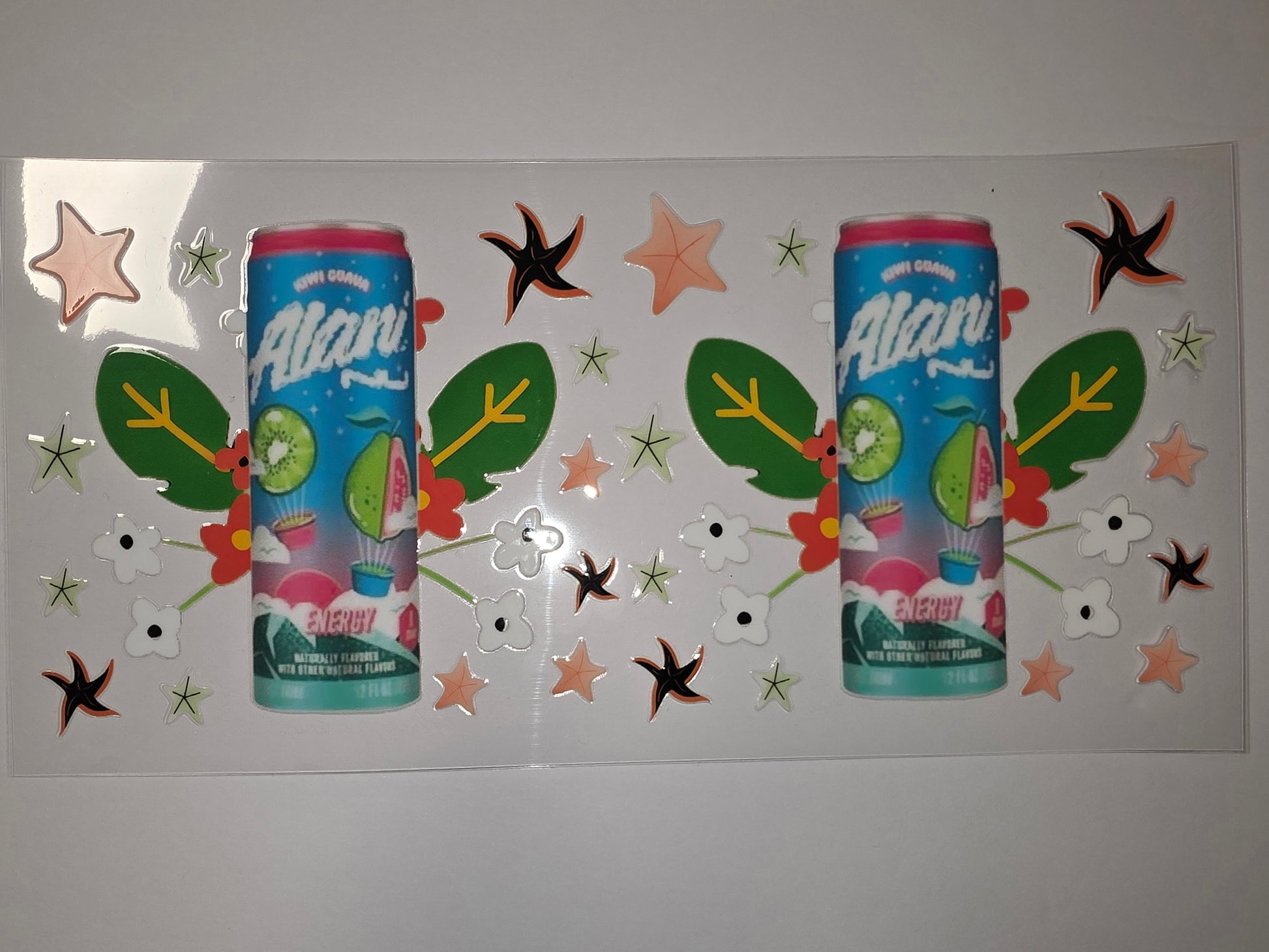 Add a splash of tropical fun to your drinkware with this vibrant tumbler wrap featuring a kiwi guava energy drink design. Adorned with cute starfish and floral accents, it's perfect for adding a playful, summery touch to your daily hydration.