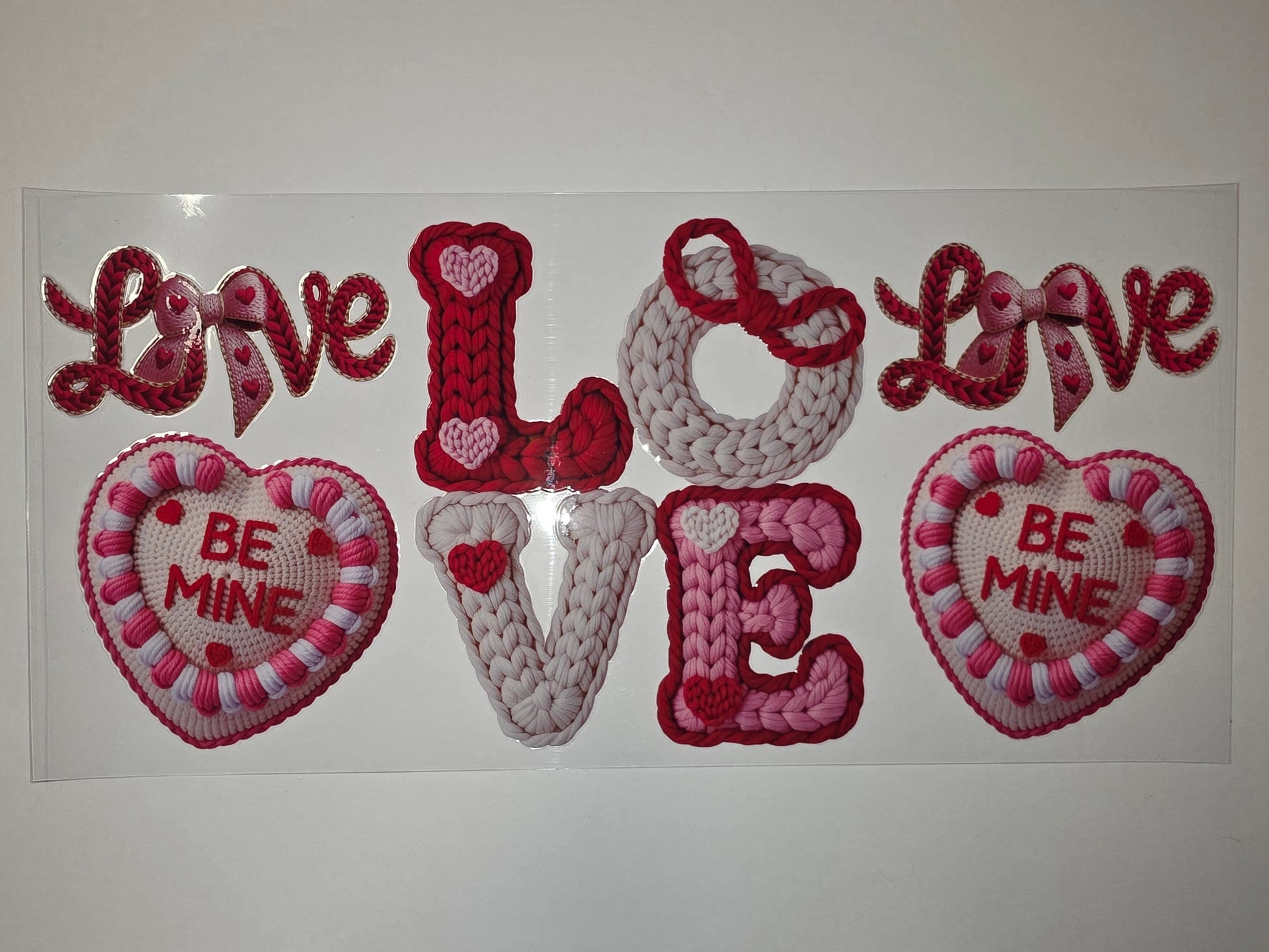 Add a touch of cozy charm to your drinkware with this adorable Valentine's Day tumbler wrap. Featuring a sweet "LOVE" design and "BE MINE" hearts in a delightful knitted texture, it's perfect for gifting or personalizing your favorite cup.