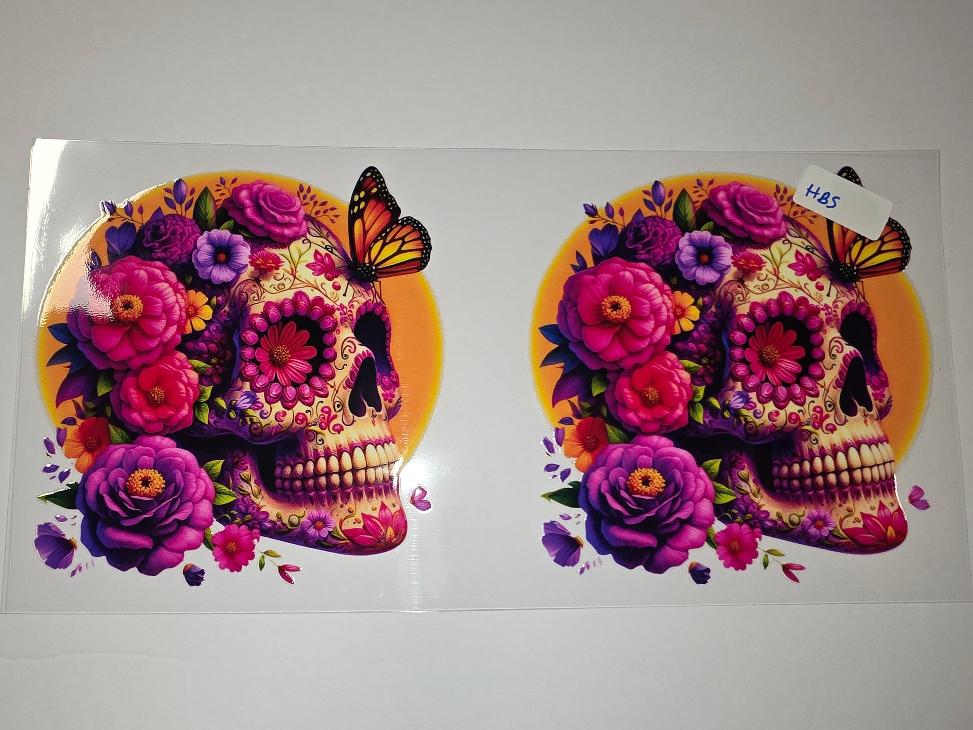 Add a touch of vibrant artistry to your drinkware with this stunning floral skull tumbler wrap. Featuring intricate sugar skull details adorned with lush pink, purple, and orange flowers and a monarch butterfly, this design is perfect for adding a festive and artistic flair to your everyday cups.